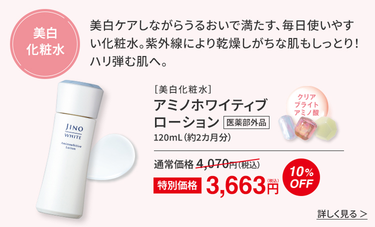 紫外線は“ゆらぎ肌”の原因の1つ。「ジーノ」のUVアイテムなら肌へのやさしさと紫外線カット力を両立しているのでおすすめです。さらに「クリアサポートアミノ酸」が日中の美白ケアをサポートし、くすみ感もケアします。