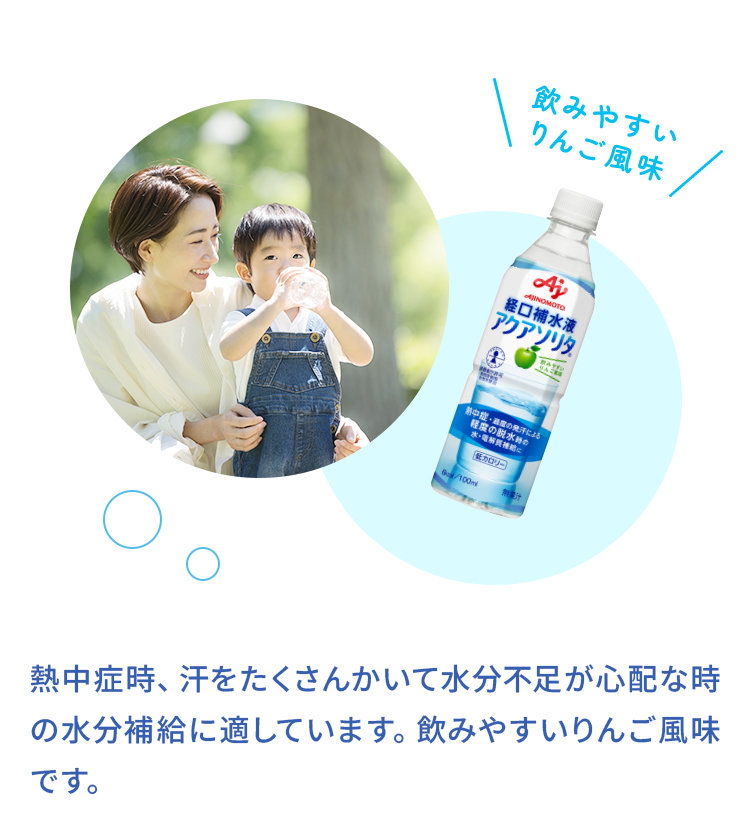 経口補水液「アクアソリタ®」は、熱中症・過度の発汗による軽度の脱水時の水・電解質補給に適しています。