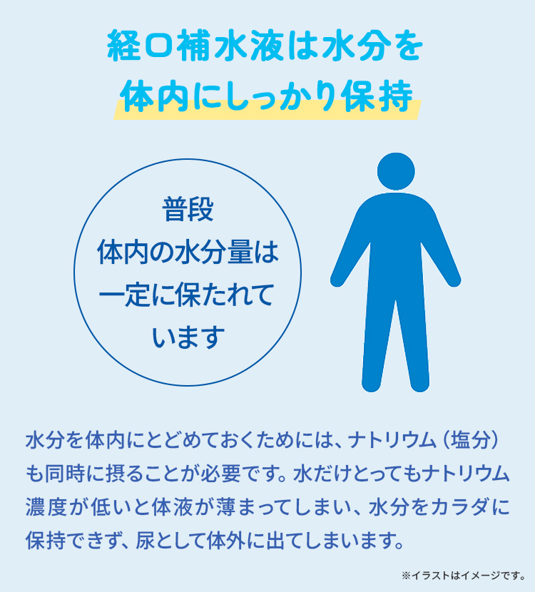 水分を体内にとどめておくためには、ナトリウム(塩分)も同時に摂ることが必要です。水だけとってもナトリウム濃度が低いと体液が薄まってしまい、水分をカラダに保持できず、尿として体外に出てしまいます。 ※イラストはイメージです。