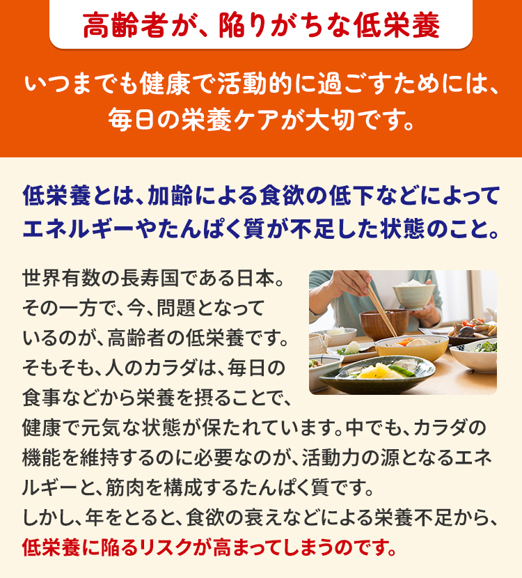 世界有数の長寿国である日本。その一方で、今、問題となっているのが、高齢者の低栄養です。 そもそも、人のカラダは、毎日の食事などから栄養を摂ることで、健康で元気な状態が保たれています。中でも、カラダの機能を維持するのに必要なのが、活動力の源となるエネルギーと、筋肉を構成するたんぱく質です。 しかし、年をとると、食欲の衰えなどによる栄養不足から、低栄養に陥るリスクが高まってしまうのです。