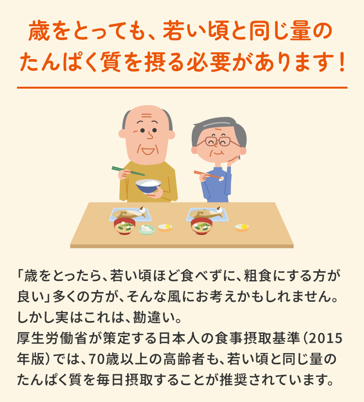 「歳をとったら、若い頃ほど食べずに、粗食にする方が良い」多くの方が、そんな風にお考えかもしれません。しかし実はこれは、勘違い。 厚生労働省が策定する日本人の食事摂取基準(2015年版)では、70歳以上の高齢者も、若い頃と同じ量のたんぱく質を毎日摂取することが推奨されています。
