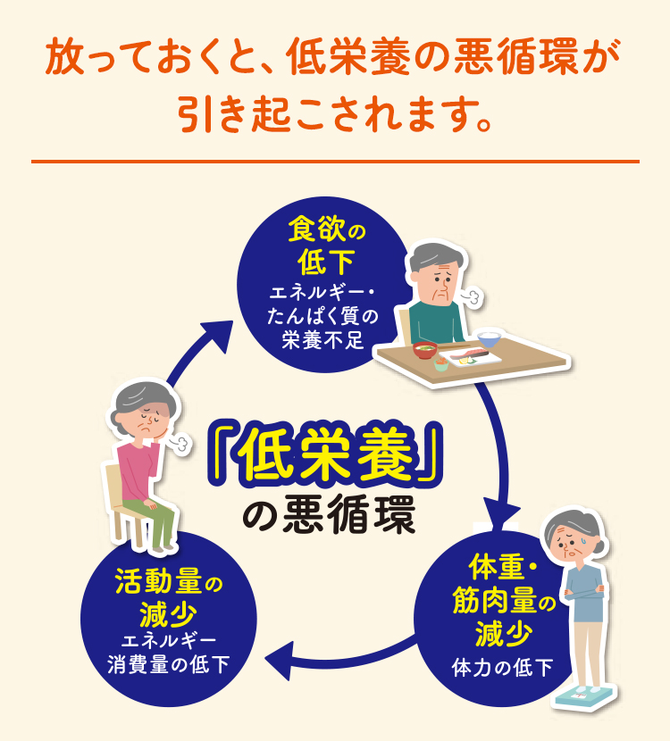 低栄養になると、体重や筋肉量が減少し、体力が低下していきます。すると、動くのがおっくうになるなどの理由で、活動量が減少してエネルギー消費量が低下するため、さらに食欲が減退し、低栄養が加速していきます。 これが、低栄養の悪循環です。