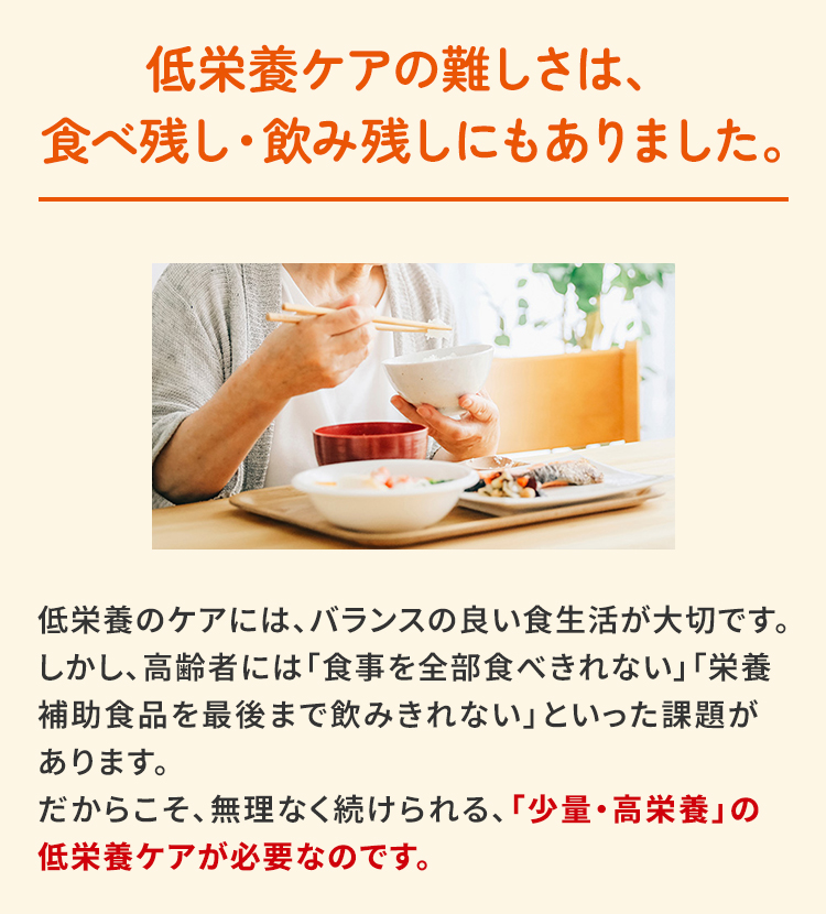 低栄養のケアには、バランスの良い食生活が大切です。 しかし、高齢者には「食事を全部食べきれない」「栄養補助食品を最後まで飲みきれない」といった課題があります。だからこそ、無理なく続けられる、「少量・高栄養」の低栄養ケアが必要なのです。