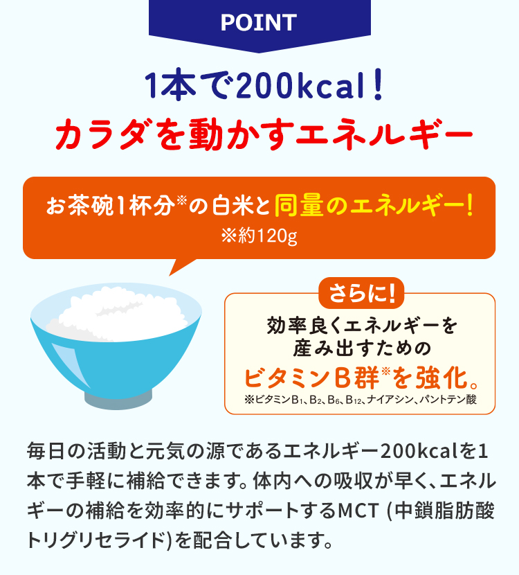 毎日の活動と元気の源であるエネルギー200kcalを1本で手軽に補給できます。体内への吸収が早く、エネルギーの補給を効率的にサポートするMCT (中鎖脂肪酸トリグリセライド)を配合しています。