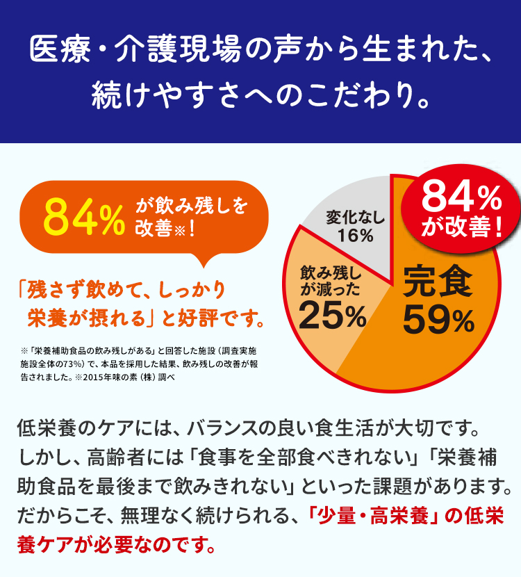 低栄養のケアには、バランスの良い食生活が大切です。 しかし、高齢者には「食事を全部食べきれない」「栄養 補助食品を最後まで飲みきれない」といった課題があります。だからこそ、無理なく続けられる、「少量・高栄養」の低栄養ケアが必要なのです。
