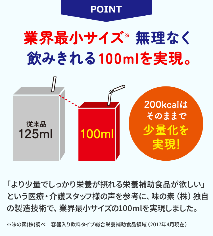 「より少量でしっかり栄養が摂れる栄養補助食品が欲しい」という医療・介護スタッフ様の声を参考に、味の素(株)独自の製造技術で、業界最小サイズの100mlを実現しました。