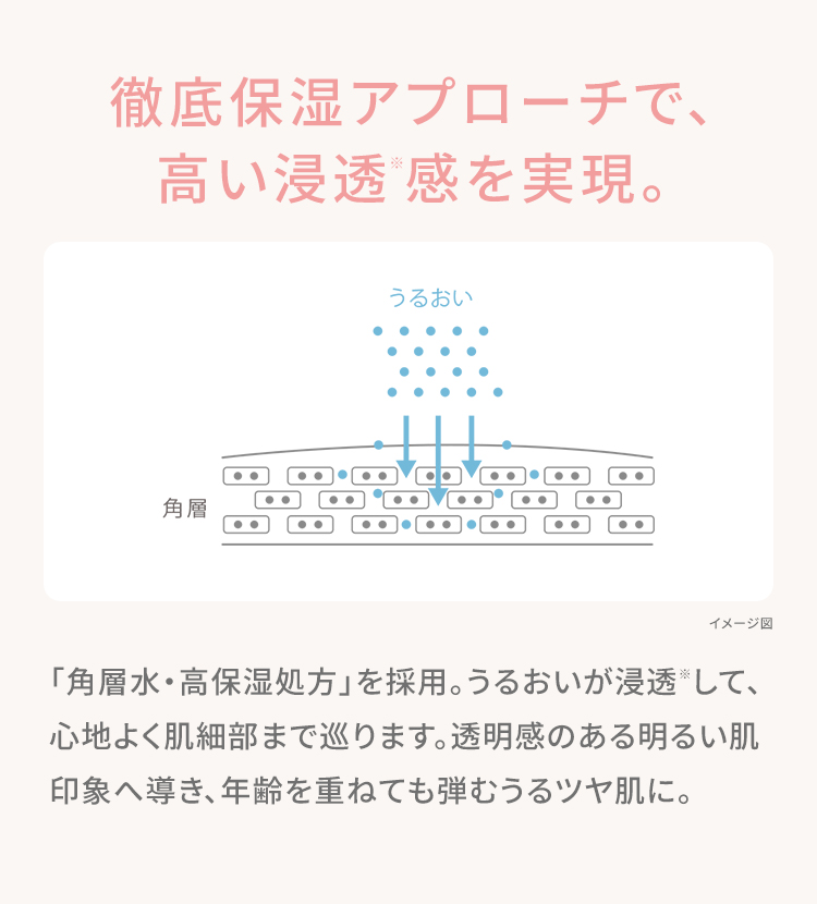 「角層水・高保湿処方」を採用。うるおいが浸透※して、心地よく肌細部まで巡ります。透明感のある明るい肌印象へ導き、年齢を重ねても弾むうるツヤ肌に。