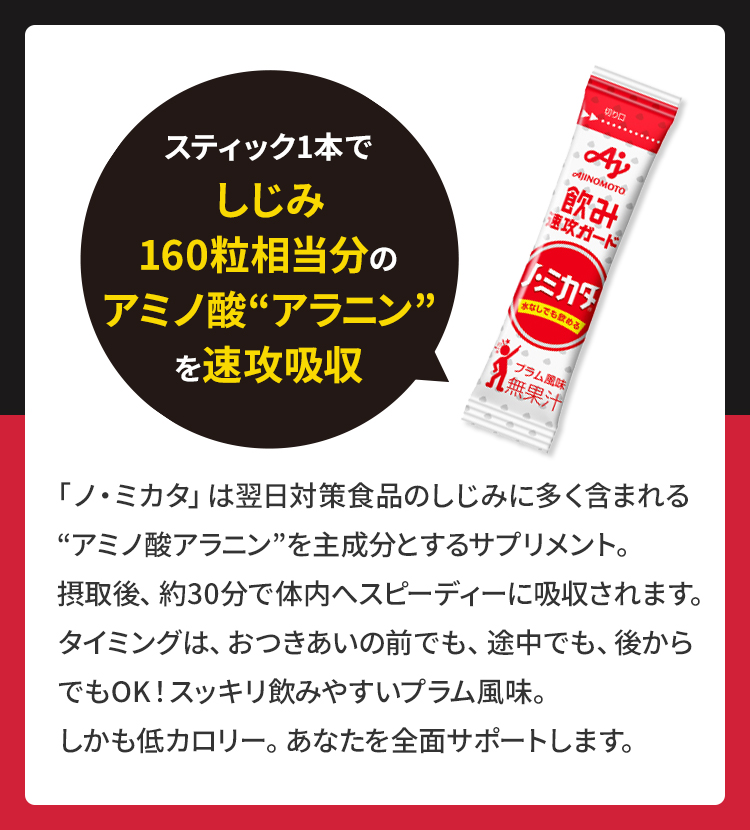 ※1日スティック1~3本を目安に、水などの飲料と一緒にそのままお召し上がりください。※「ノ・ミカタ」はお付き合い時の楽しい飲み方を応援するアミノ酸サプリメントです。しじみ160粒相当分のアミノ酸アラニンが主成分で、速攻吸収(約30分)されるのが特長です。※口どけのよい顆粒状で、溶かさずにお召し上がりください。※体質・体調により、まれにからだに合わない場合があります。その場合は、ご利用をおやめください。※妊娠・授乳中の方、および薬剤を服用されている方は、医師とご相談のうえ、お召し上がりください。