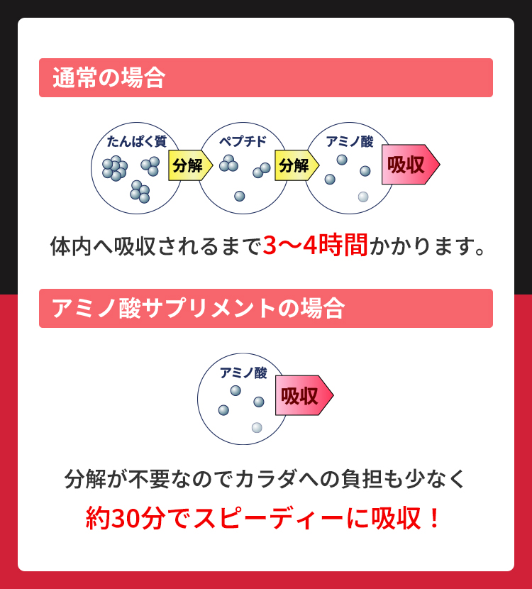 アミノ酸は、肉・魚介類・豆類・卵や乳製品などに多く含まれているたんぱく質を構成する栄養素で、これらの食品から毎日バランスよく摂取する必要があります。 しかし、たんぱく質の形では、分解されてアミノ酸として吸収されるには数時間を要します。 一方、アミノ酸として摂取すると、消化分解の必要がないため、カラダへ負担をかけることなく約30分で吸収されます。ですから、おつきあいなどでアミノ酸がカラダに足りなくなりがちなシーンでも、すぐにチャージできるすぐれた特徴があります。